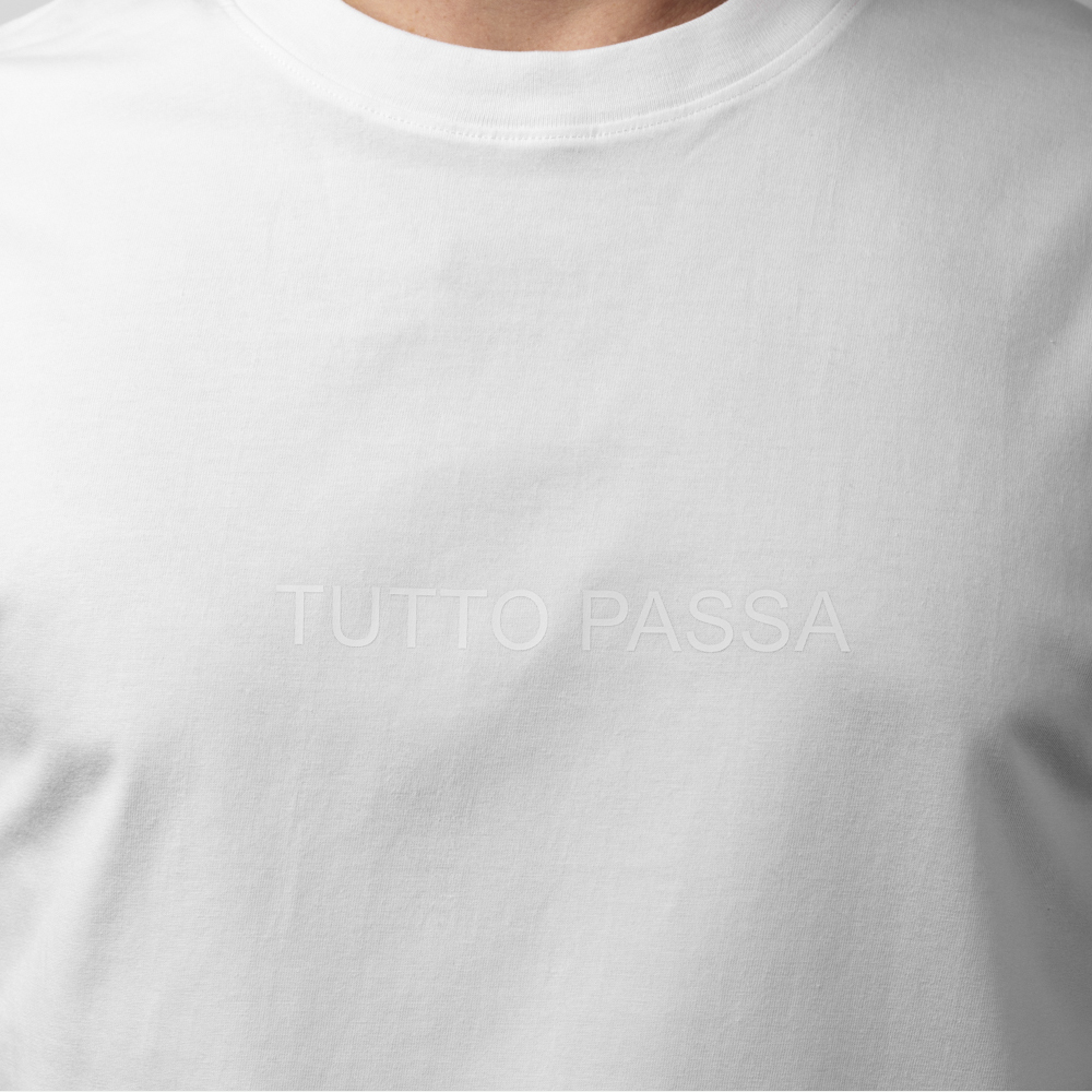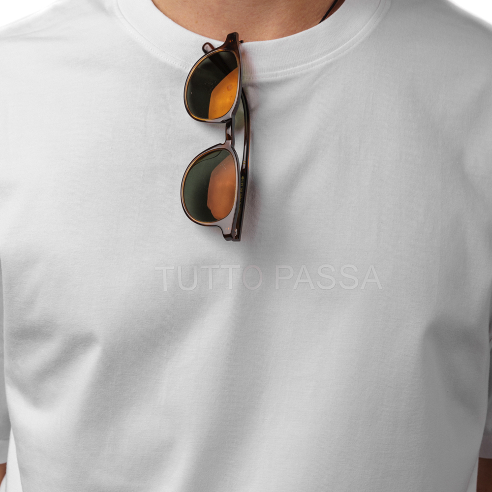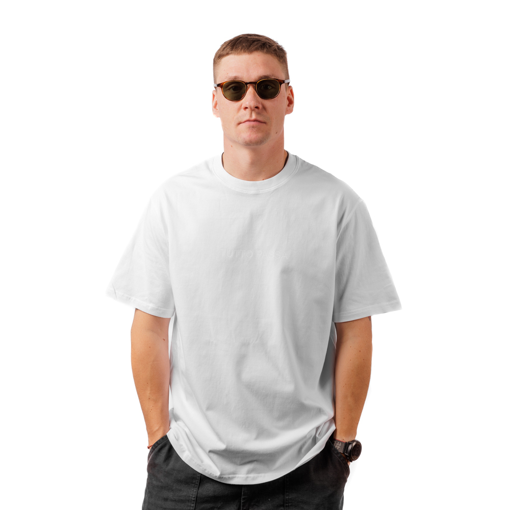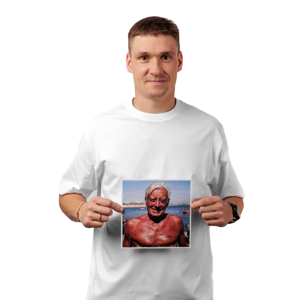 Белая оверсайз футболка из 100% хлопка. Надпись на итальянском "Tutto passa" – вдохновлена сериями фотографий Robbie Mcintosh, сделанными 7 июля 2023. Неаполитанский фотограф-документалист любит наблюдать за поведением людей и их отношением к окружающему миру. Робби Макинтош снимает большинство своих сюжетов на берегу моря, вдали от безумия города. Местные жители, одетые только в купальники, затягиваются табаком, купаются и чистят устриц. Хотя Робби регулярно встречается с завсегдатаями пляжей, он старается не заводить с ними дружбу. “Хороший фотограф не должен слишком увлекаться. Гораздо лучше быть дружелюбным, любопытным, танцующим призраком”.