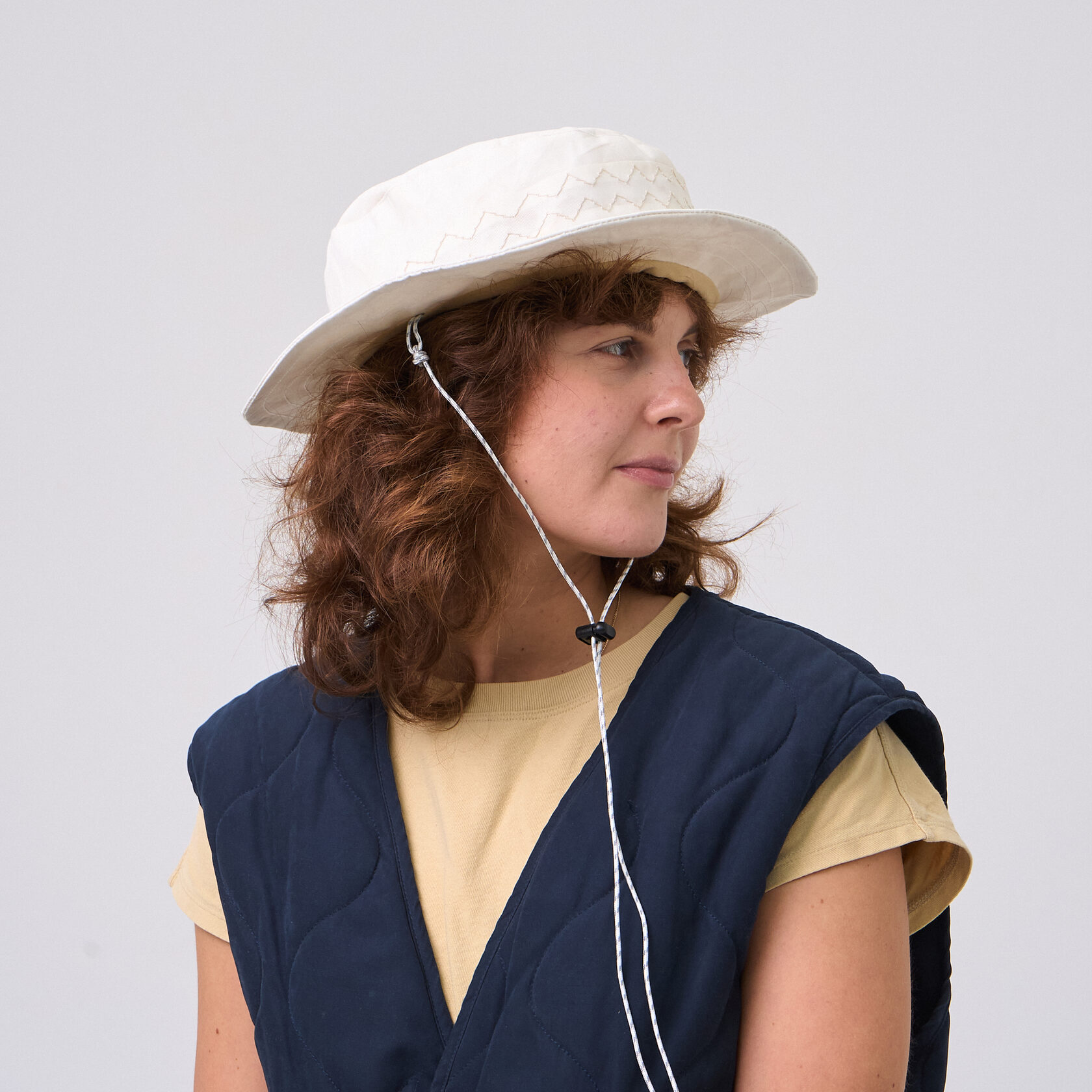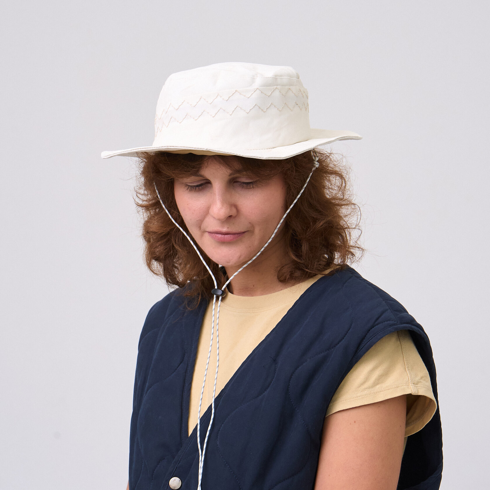 Панама из оливкового итальянского хлопка. Декоративная отстрочка с репшнуром. Проводка в полях позволяет задать им форму. Кулиса для фиксации панамы из репшнура.