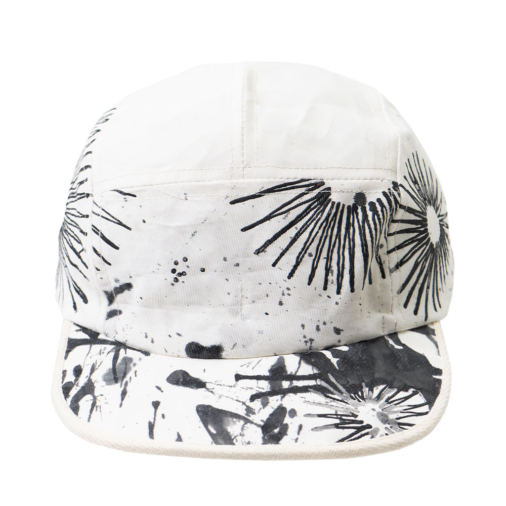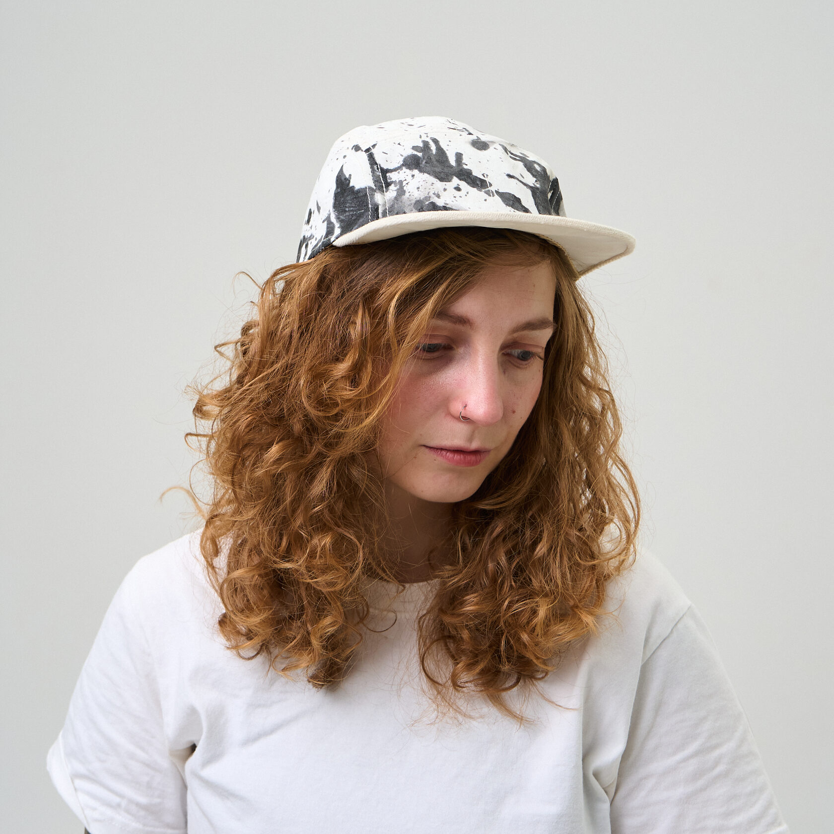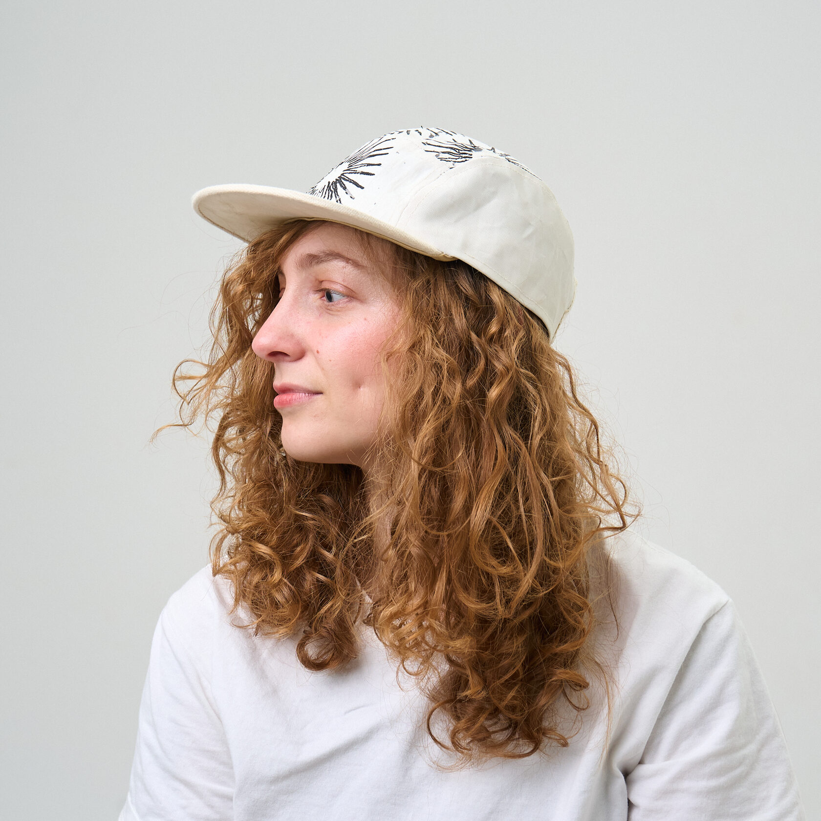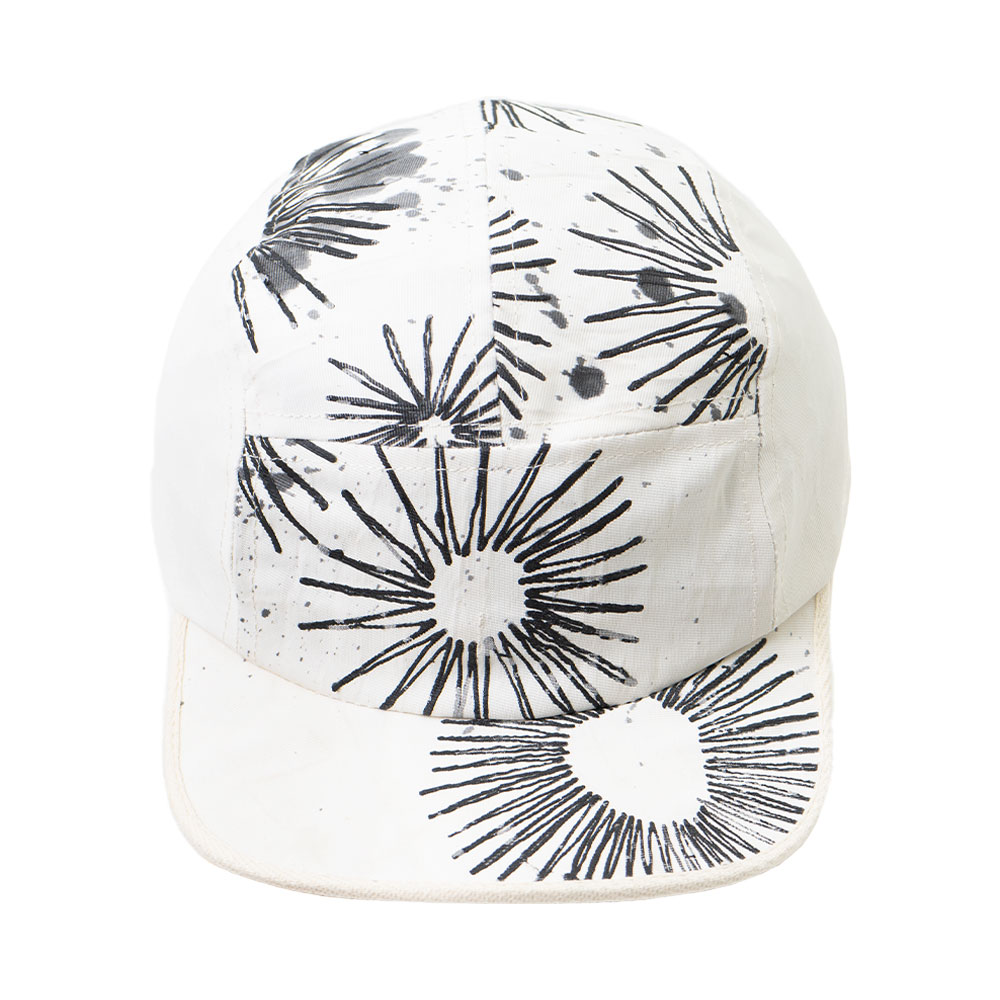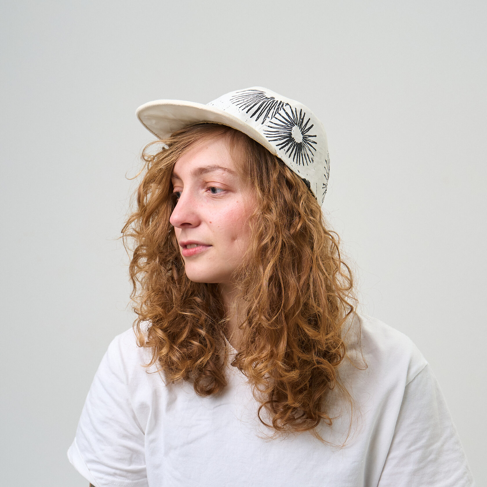 Пятипанельная апсайкл кепка из средиземноморского паруса. Бело-молочный парус разрисовала для нас Настя – основательница бренда Naomakes.