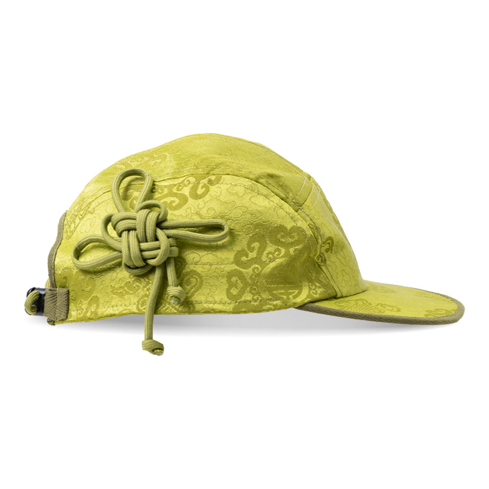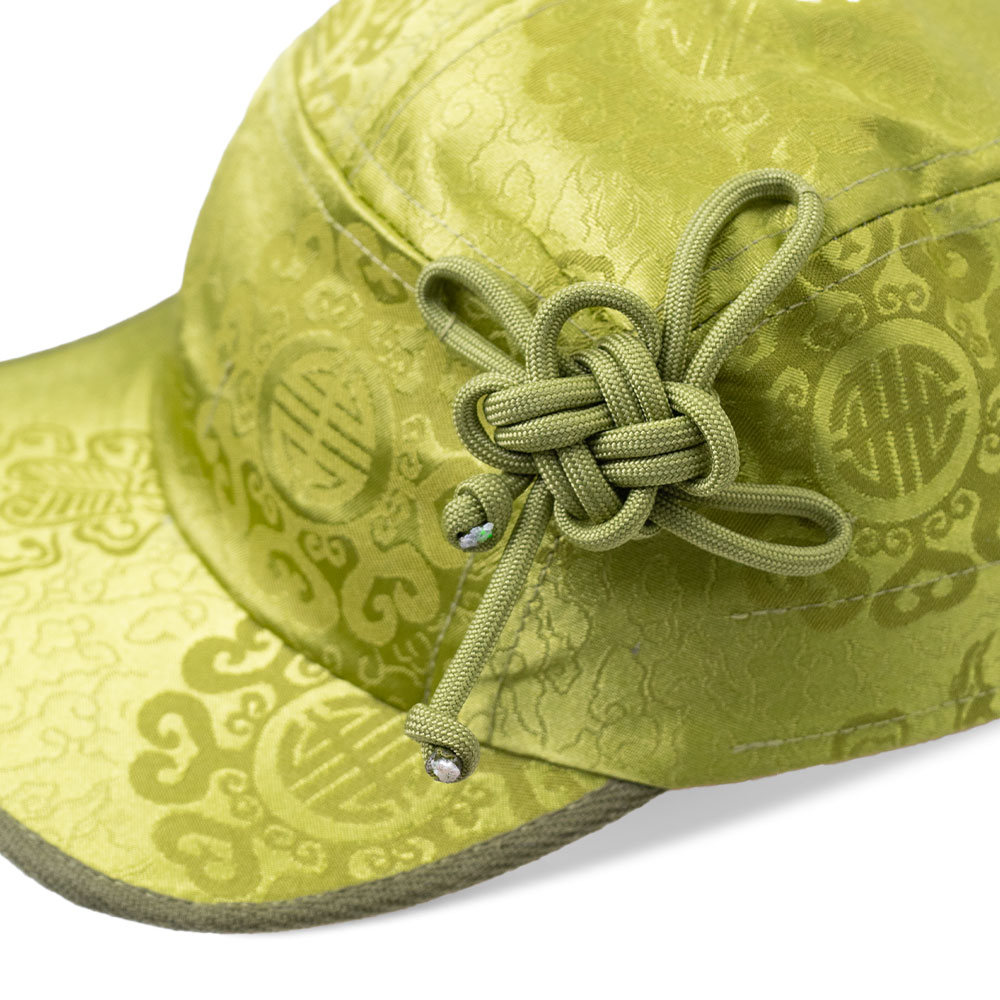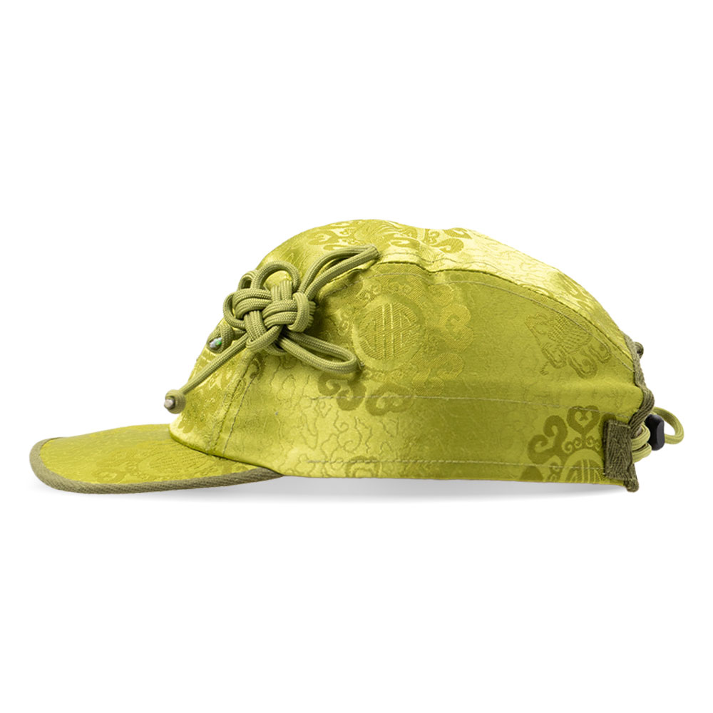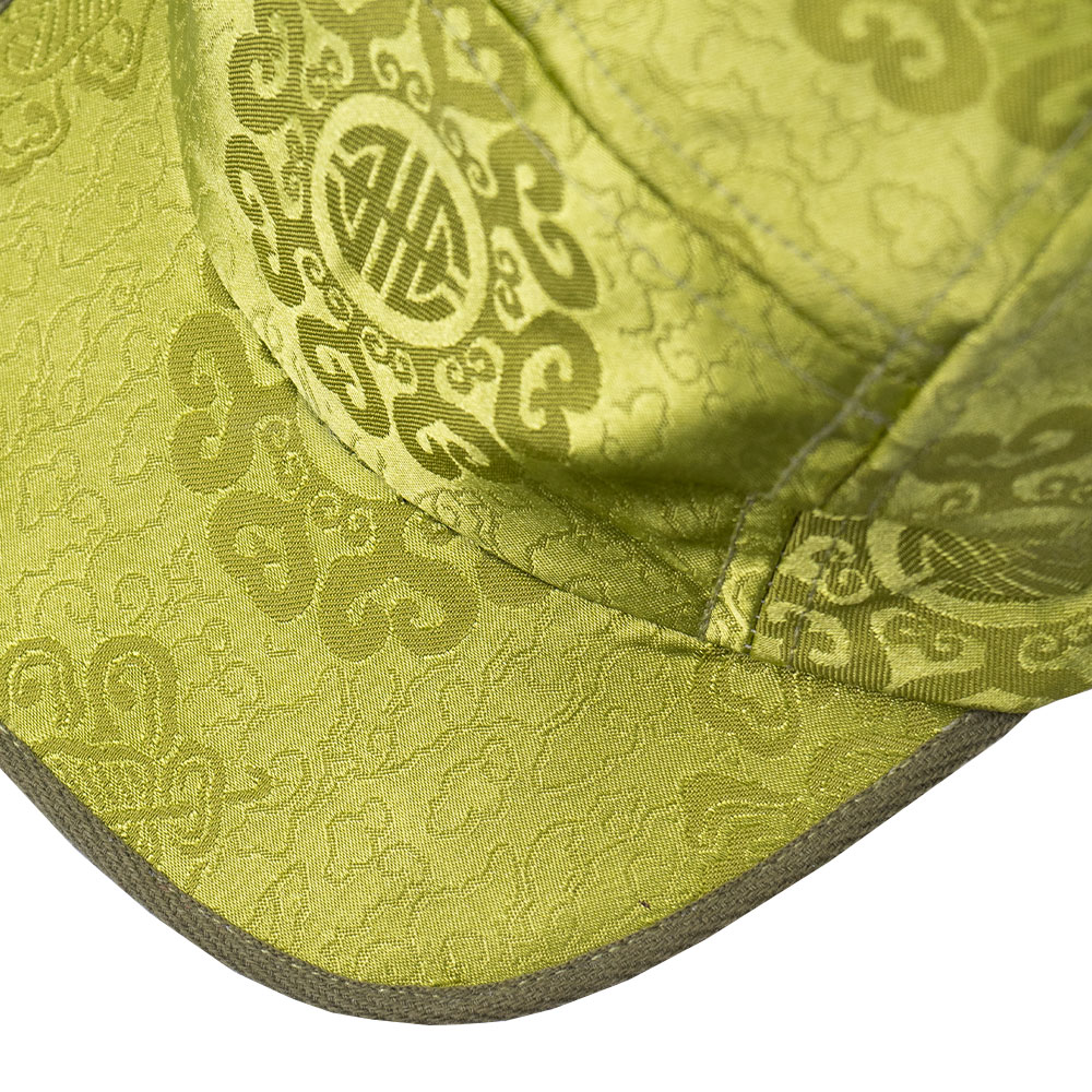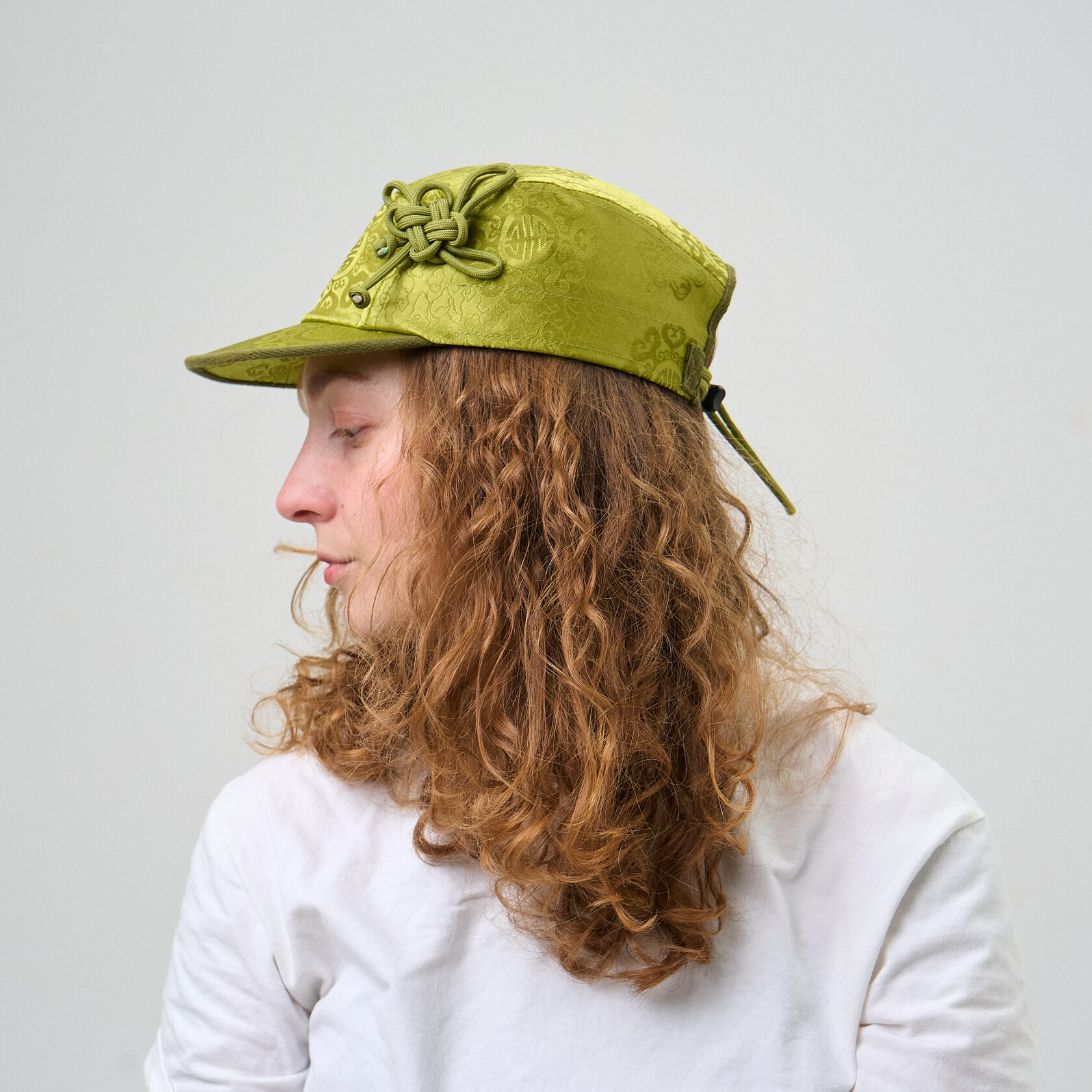 Атлас цвета монгольского зелёного яблока, имеет народный орнамент региона. Иероглиф из репшнура на правой панели. Средняя посадка короткий козырёк. Регулировка размера на кулисе.