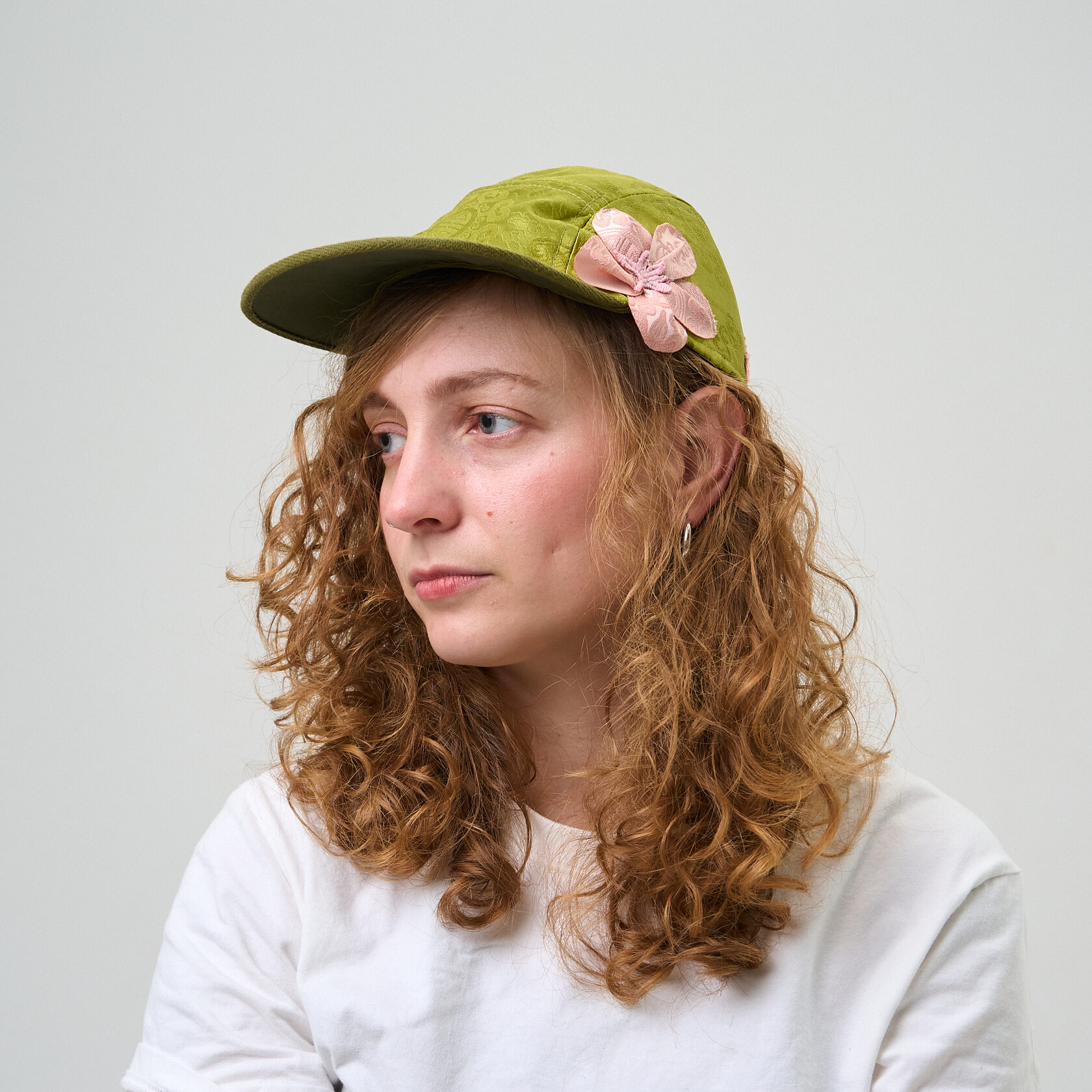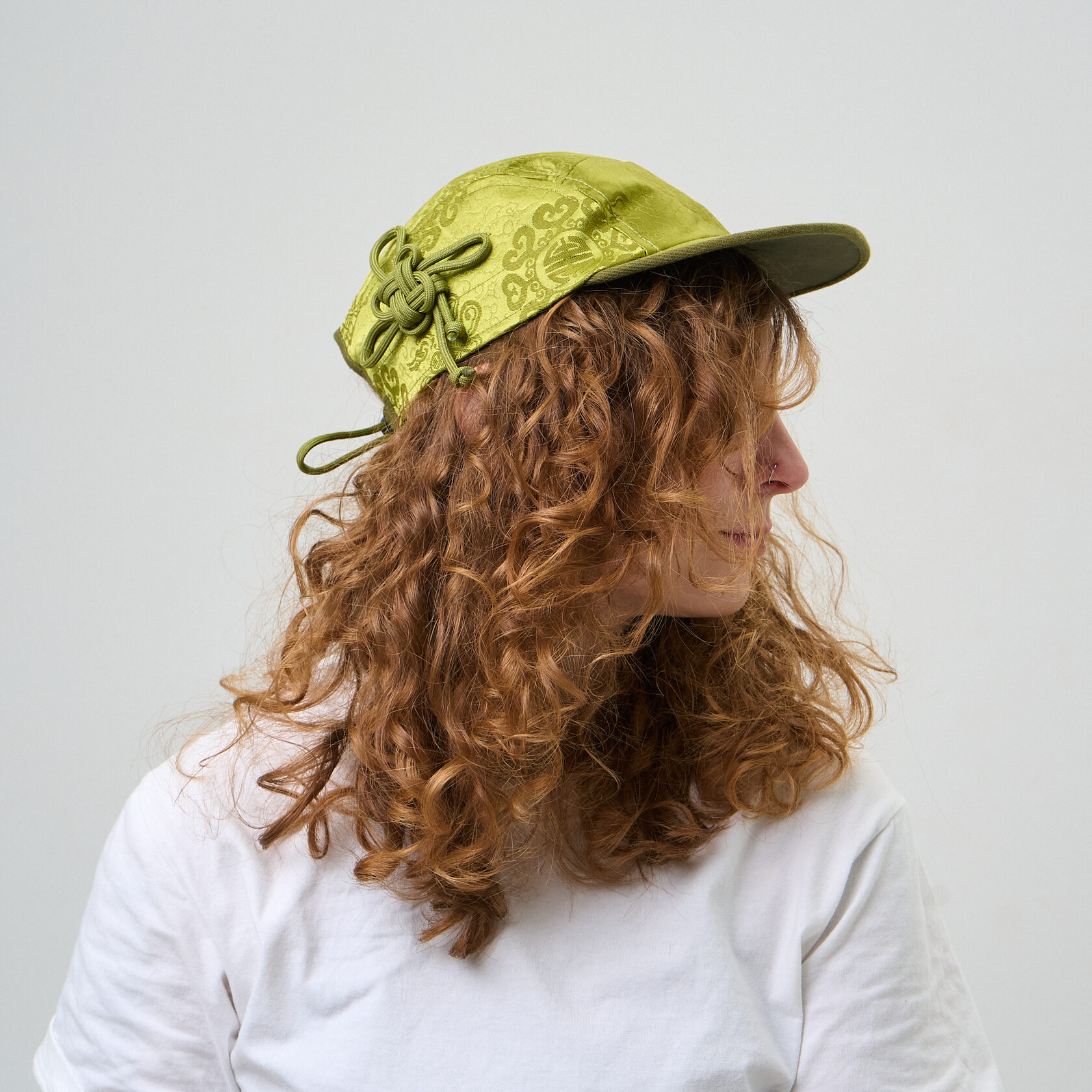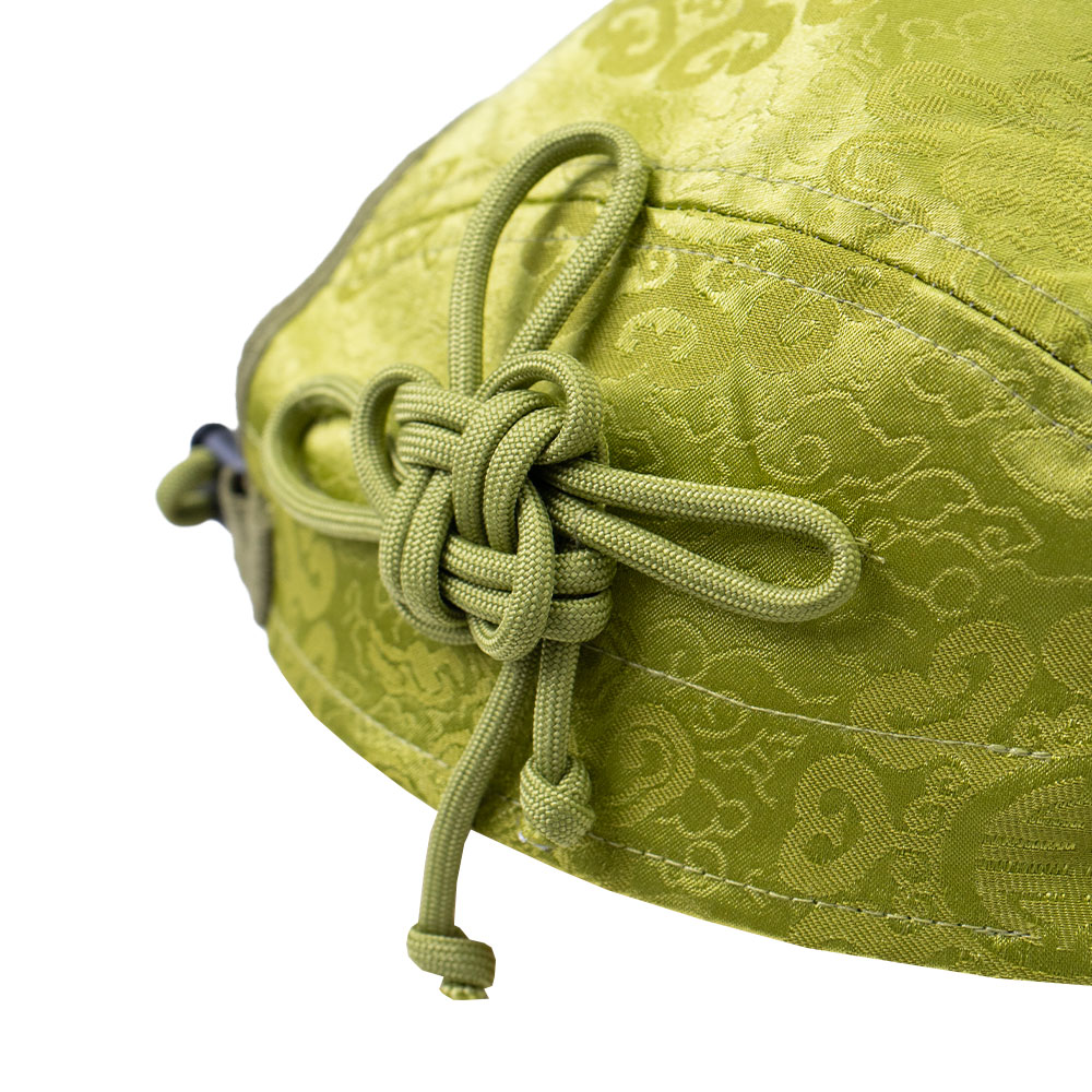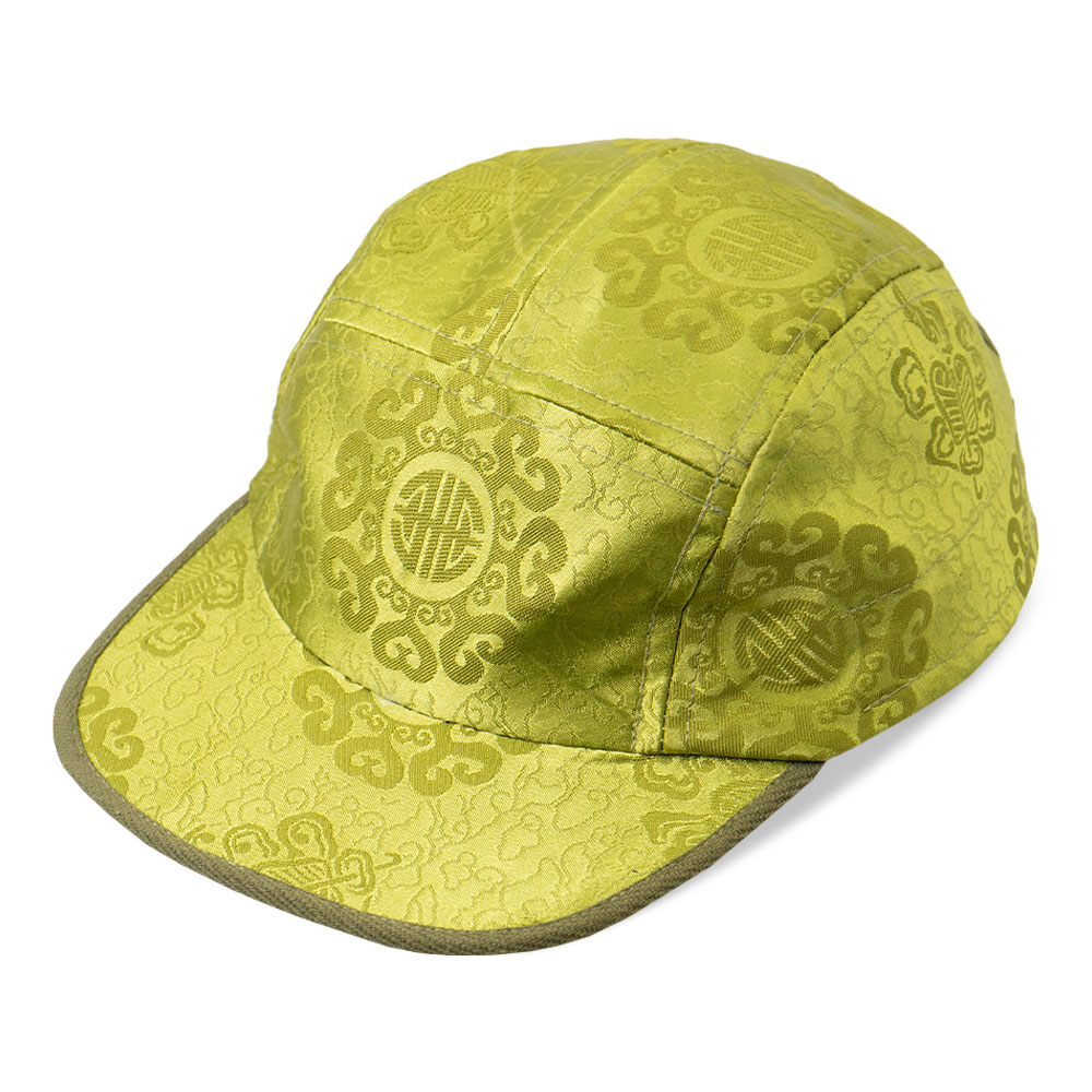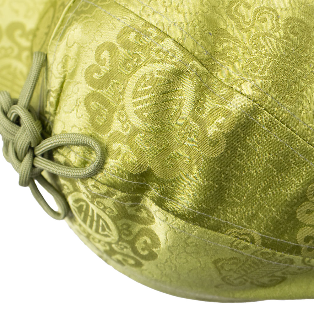 Атлас цвета монгольского зелёного яблока, имеет народный орнамент региона. Иероглиф из репшнура на правой панели. Средняя посадка короткий козырёк. Регулировка размера на кулисе.