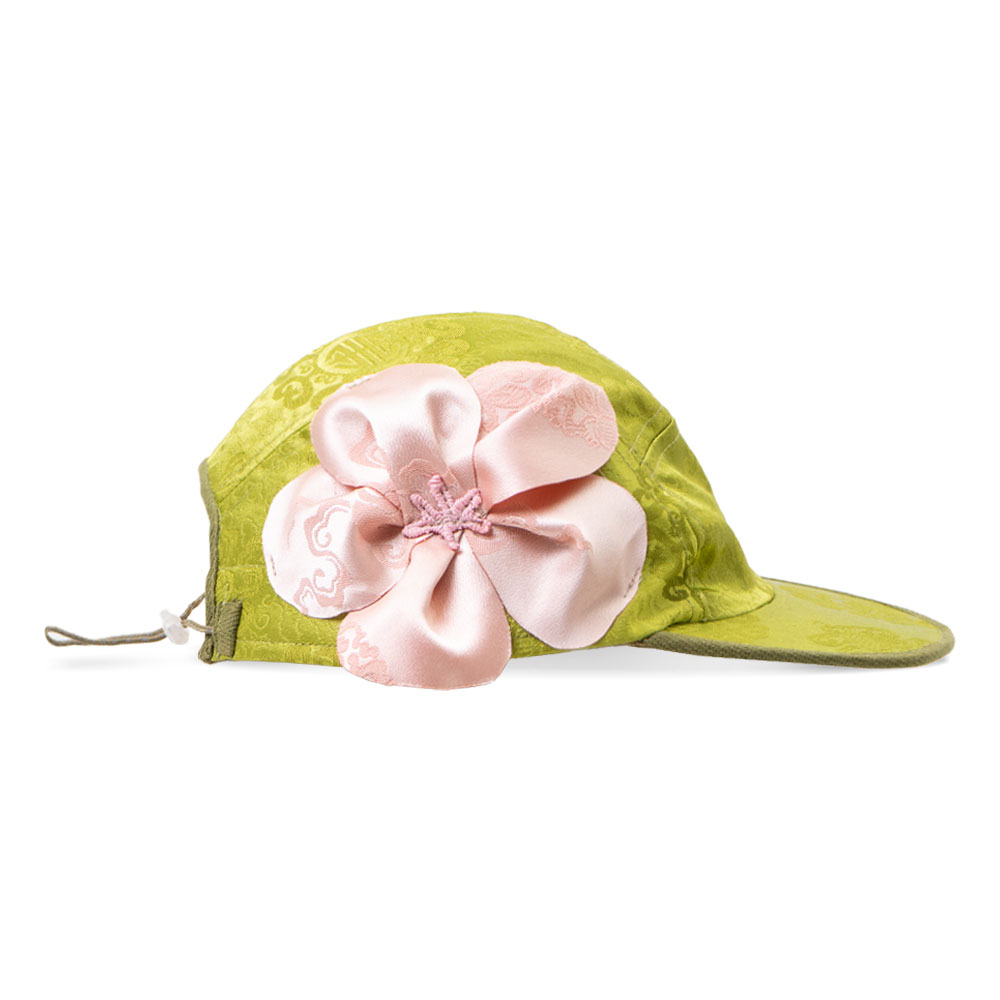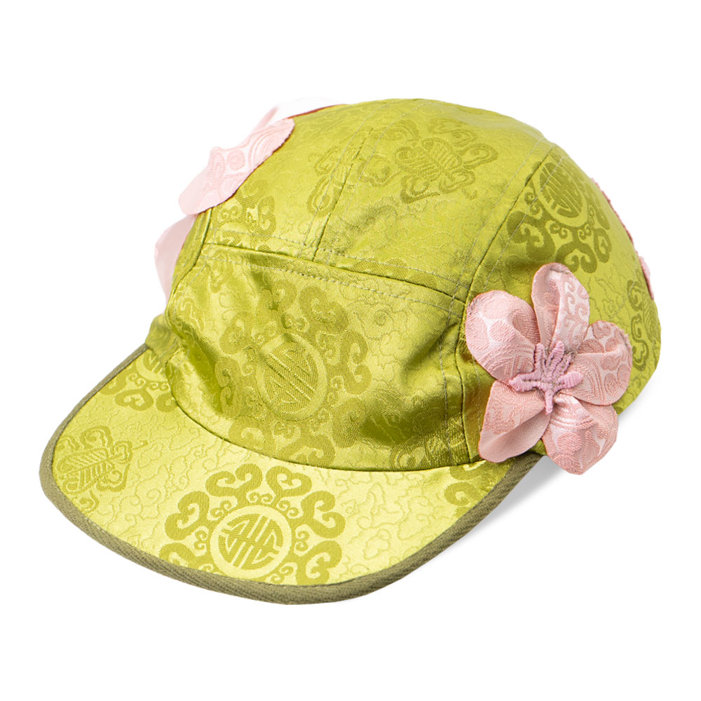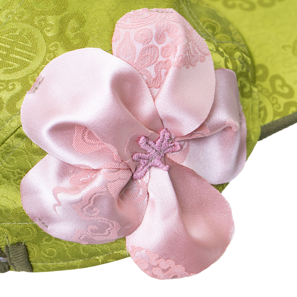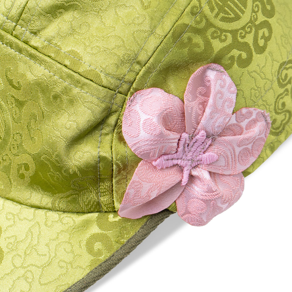 Атлас цвета монгольского зелёного яблока, имеет народный орнамент региона. Лилии из нежно-розового атласа на правой и левой панелях. Средняя посадка короткий козырёк. Регулировка размера на кулисе.