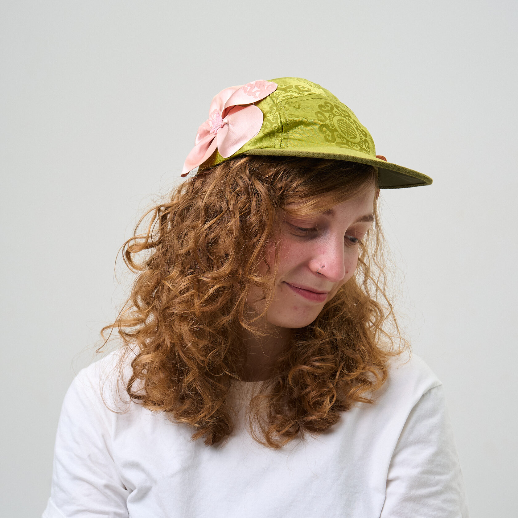 Пятипанельная кепка из яблочно-зелёного "монгольского" атласа, который для нас привезли друзья из поездки по Бурятии. Ткань куплена в Улан-Удэ.