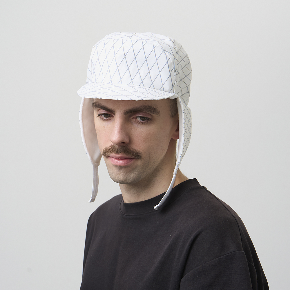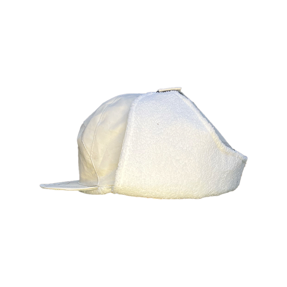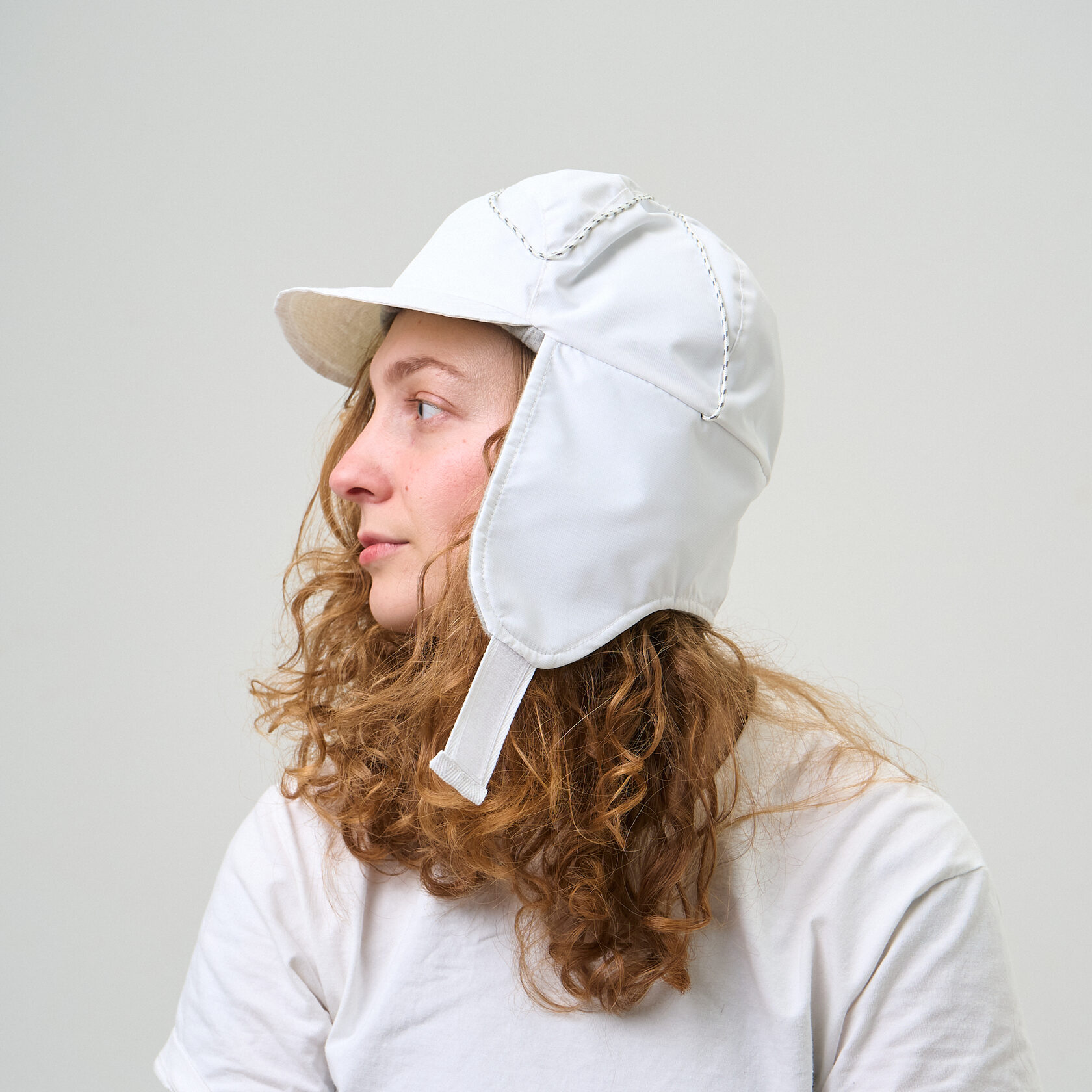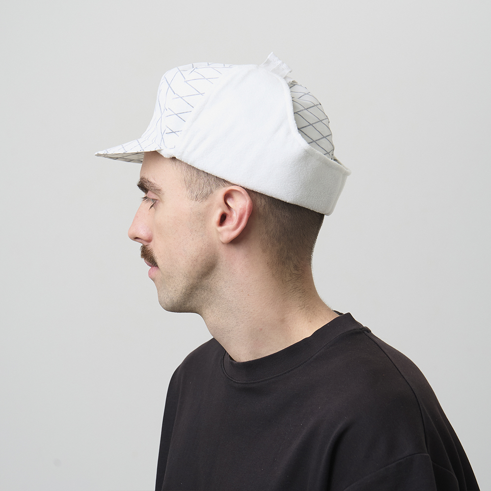 Ушанка из белой мембранной ткани с кашемировой подкладкой. Короткий козырёк, белая надпись «Jusqu’ici tout va bien» (Пока всё идёт хорошо) на передней панели, декоративная отсрочка белым репшнуром.
