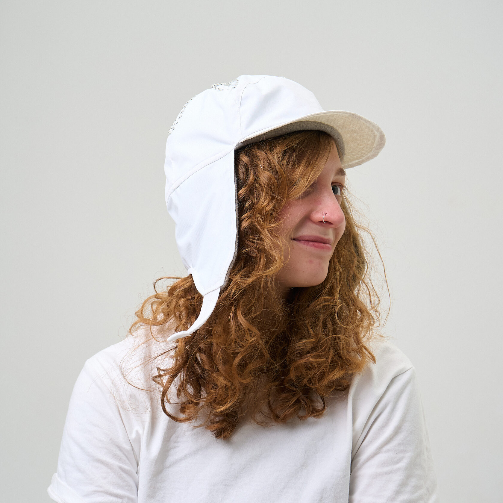 Ушанка из белой мембранной ткани с фисовой подкладкой. Короткий козырёк, белая надпись «Jusqu’ici tout va bien» (Пока всё идёт хорошо) на передней панели, декоративная отсрочка белым репшнуром.